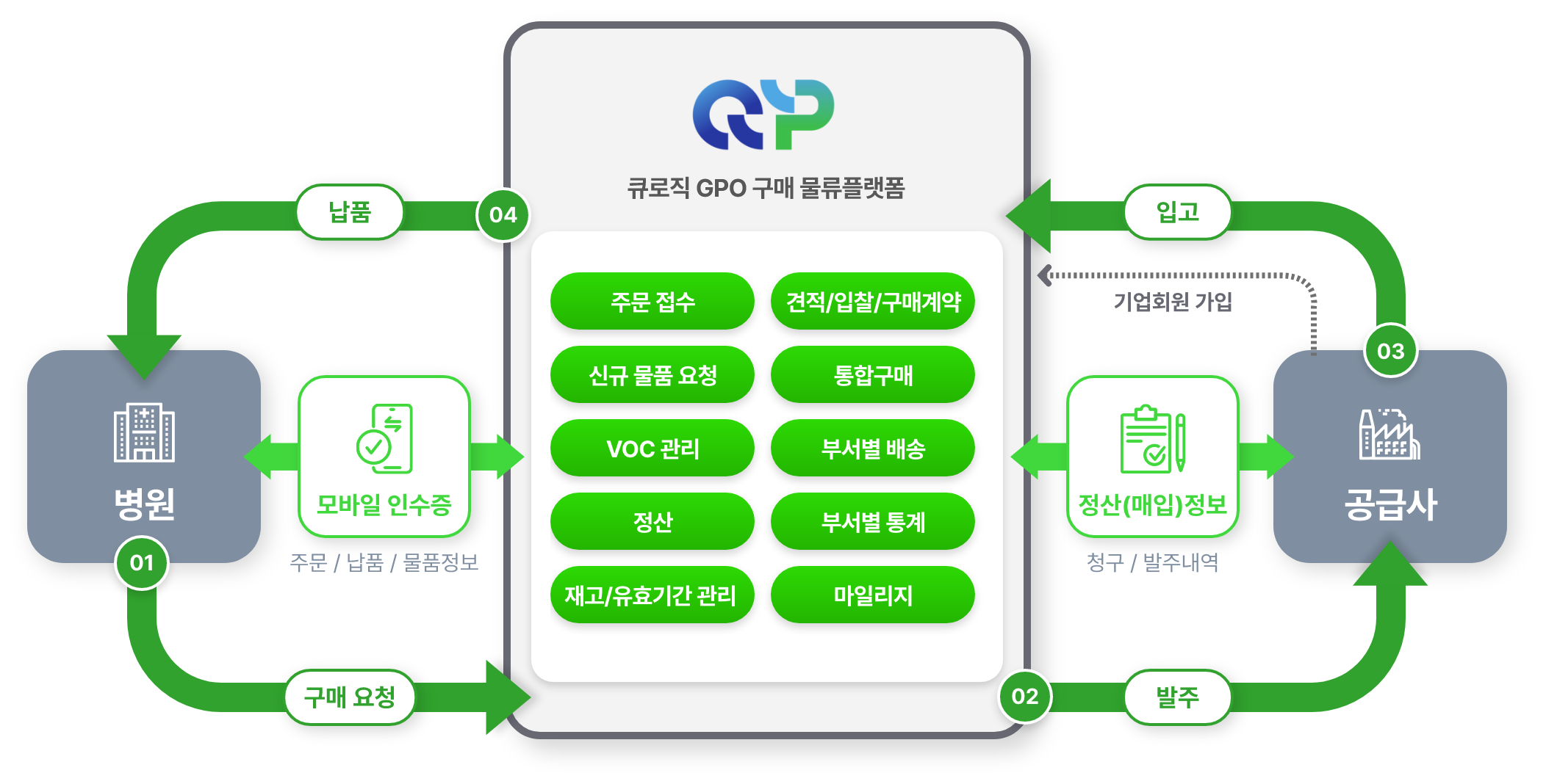 Q-Platform은 독자 개발한 GPO서비스 지원 플랫폼으로 정보시스템을 연동시켜 고객병원과 GPO, 공급사간의 원활한 서비스 흐름을 제공합니다.